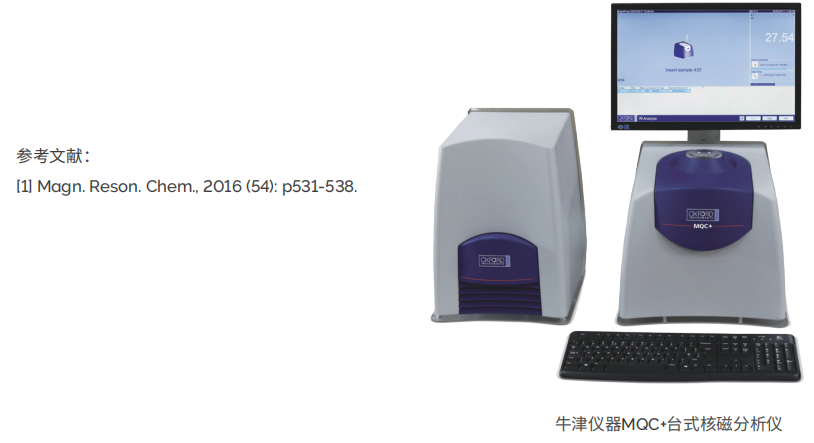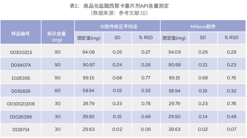 Elipe等人利用牛津仪器时域核磁共振分析仪 MQC+ ,对三种剂量(30、60和90 mg)的盐酸西那卡塞商 品化片剂进行了测试 [1]。研究人员首先成功建立了药物活性成分(active pharmaceutical ingredient,API) 含量与核磁共振19F信号强度相关标准曲线。然后对市售片剂不同剂量及批次样本进行了含量测定,并采用不 同软件做了分析,结果列于表1。