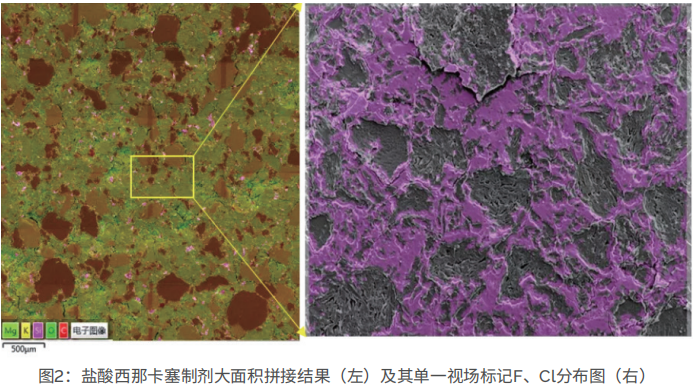 此外,牛津仪器Xplore及UltimMax系列能谱仪可以对医药制剂中的元素含量及分布进行分析。借助Aztec 分析软件的大面积拼接(Large Area Mapping, LAM)功能,可以获得样品大范围元素分布图,实现从微观到 宏观更全面的样品分析。 对盐酸西那卡塞制剂的氟(F)、氯(Cl)元素进行标记后,通过能谱仪来观察API的分布。图2左侧是盐酸西那 卡塞制剂的元素能谱大面积拼接叠加图,右侧则是提取出来的单一视场F、Cl分布图。