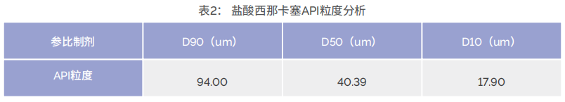 由于药物粒度及粒度分布对最终药物的性能(如溶解 度、溶出度和生物利用度等)具有显著影响,因此API粒 度是固体口服制剂药物开发和质量控制的关键点之一。利 用Aztec软件,将盐酸西那卡塞API从制剂中提取出来,进 行粒度统计分析。表2显示了盐酸西那卡塞API粒度分析结 果,可以看到中值粒径约为40微米。