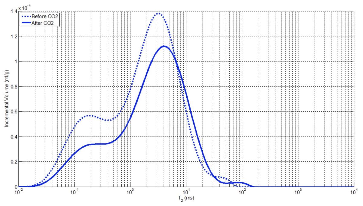 核磁共振岩心分析中使用的所有实验都有助于评估潜在的碳储存项目。例如,基于NMR T2的孔隙度和孔径分布测量可用于确定岩石中的碳储存能力。在最近与哥伦比亚大学凯利研究小组的一项合作研究中,我们使用了NMR T2数据来增强火成岩中的碳矿化研究。下图展示了碳化卤水驱替前后岩石的T2分布。驱替后核磁共振信号的减少,表明卤水中的碳正在与岩石基质发生反应,并在岩石中生成碳基矿物。