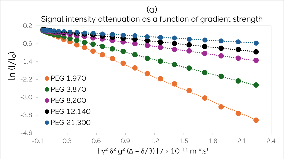 使用配备脉冲场梯度的MQC-R仪器,在重水(D₂O)中测得的稀释单分散聚乙二醇(PEG)标准品(分子量范围为1,970至21,300 mg.mol⁻¹)的扩散系数数据如图所示。单分散PEG的对数信号强度随梯度强度(g)增加而衰减,遵循单指数趋势,如图(a)中的最小均方拟合虚线所示。因此,每个单分散PEG样品均表现为单一的扩散系数,与预期一致。
