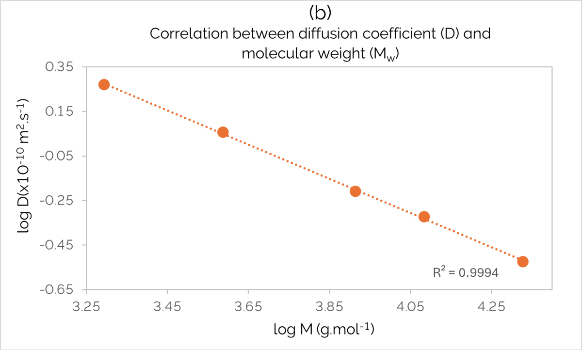 对于多分散聚合物,将获得多指数衰减,表明存在多个扩散系数。在这种情况下,使用基于逆拉普拉斯变换(ILT)的数值方法来确定扩散系数分布曲线。此外,在稀释条件下,扩散系数(D)与分子量(Mw)之间的关系遵循方程 D=kMw⁻α。