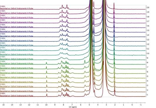 图3:在线监测3-硝基苯甲醛还原为3-硝基苯甲醇的一维1H NMR系列堆叠谱