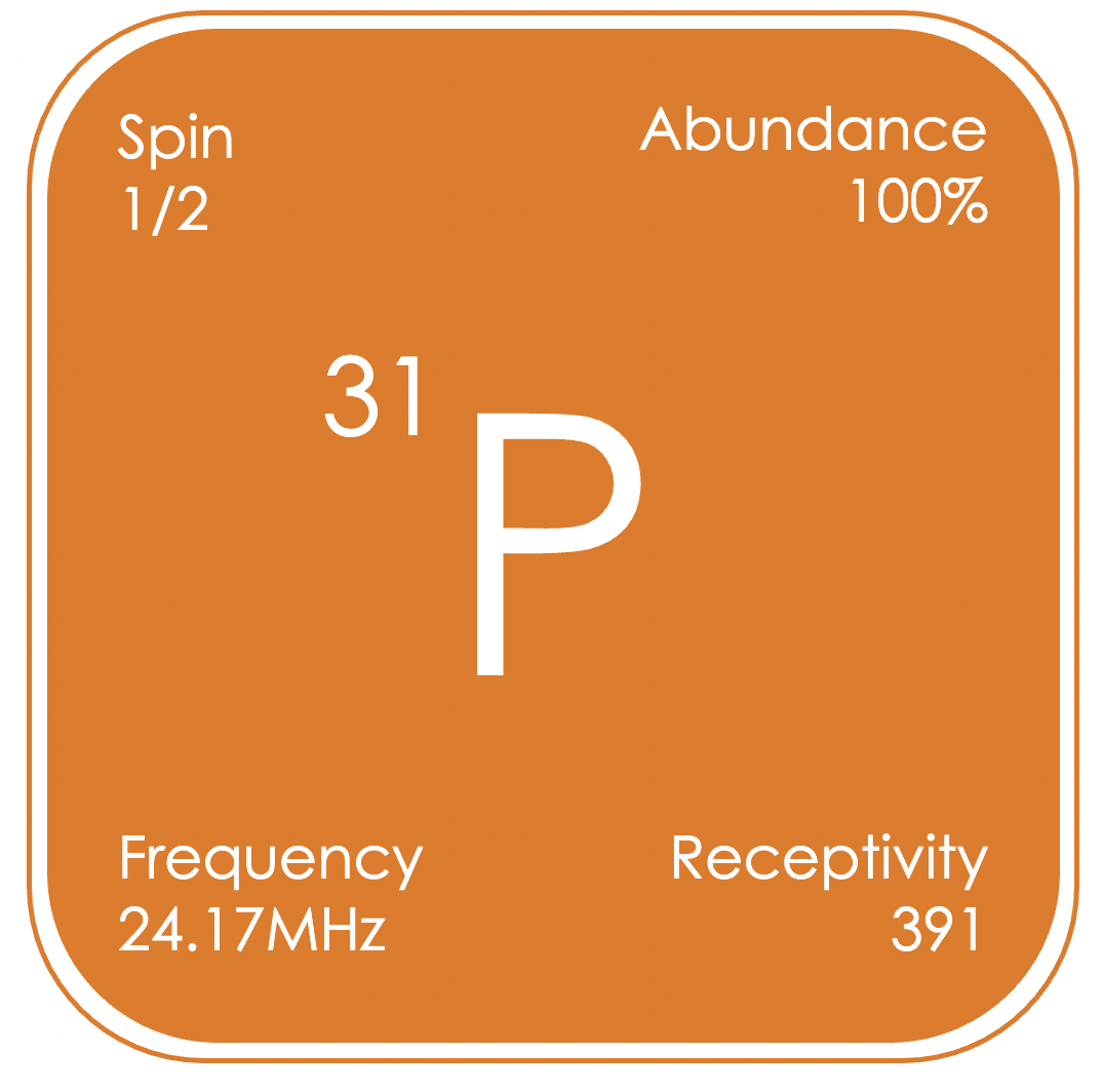 31P的NMR谱常用于配位化学和催化分析,因为该领域经常涉及含磷配体的使用。同时,由于磷酸盐(PO43-)在许多生化途径中的重要性,含磷化合物常用于药物和膳食补充剂,这些都可以通过核磁共振进行研究。此外,还存在许多含磷的阴离子,如常用在锂离子电池中的六氟磷酸盐。31P通常也是质子去耦谱图,通常在δP −80~+250 ppm的范围内给出尖锐的信号。(相对于D2O中的H3PO4)