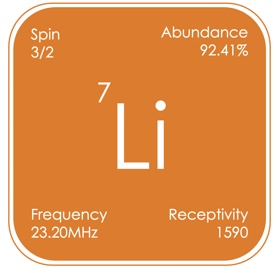 含锂化合物也是有机金属化学中非常重要的试剂。虽然锂会被用于制药,但是其没有已知的生物学作用。锂的一个快速发展的应用是储能系统和含有锂离子的溶液,例如电池中使用的锂电解液,这是非常值得通过核磁共振波谱来研究的。7Li是一个四极核,其线宽强烈依赖于分子的对称性和大小。7Li的信号出现在δLi +15~−20 ppm的范围内(相对于 D2O 中的 LiCl)。