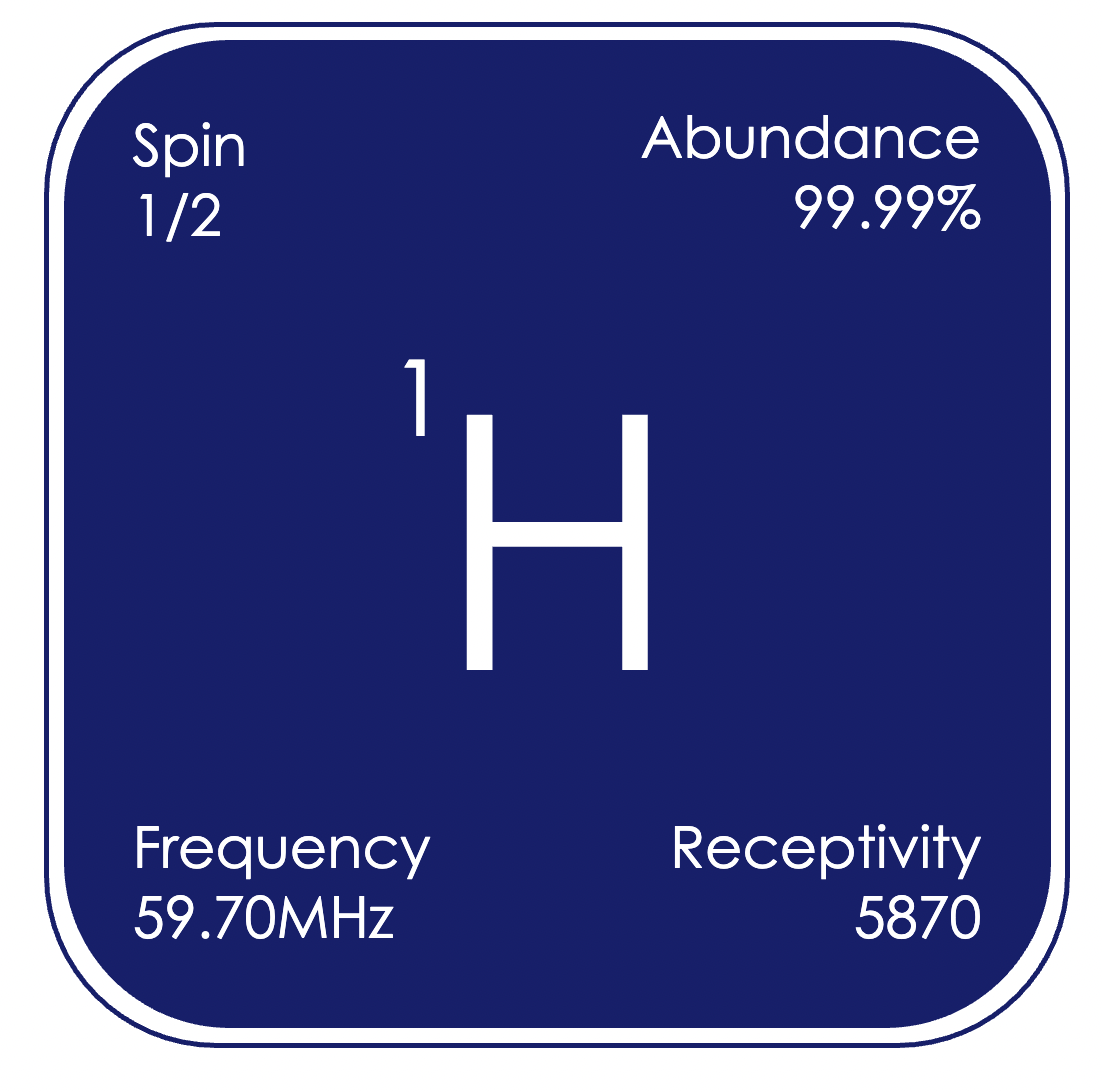 X-Pulse宽带台式核磁共振波谱仪包含用于观察不同原子核的三个通道:一个用于氘(2H)的锁定信号;另一个用于高频质子(1H)和氟(19F)信号;第三个是宽带X通道,覆盖广泛的其他原子核(覆盖25~11 MHz频率范围),通常被核磁共振波谱学家称为X核。在比较不同的原子核及其对核磁共振的适用性时,需要考虑许多重要因素。通常被描述为自旋、丰度、频率和接收度。我们的应用文章中将介绍更多关于这些因素如何影响核磁共振波谱的信息。