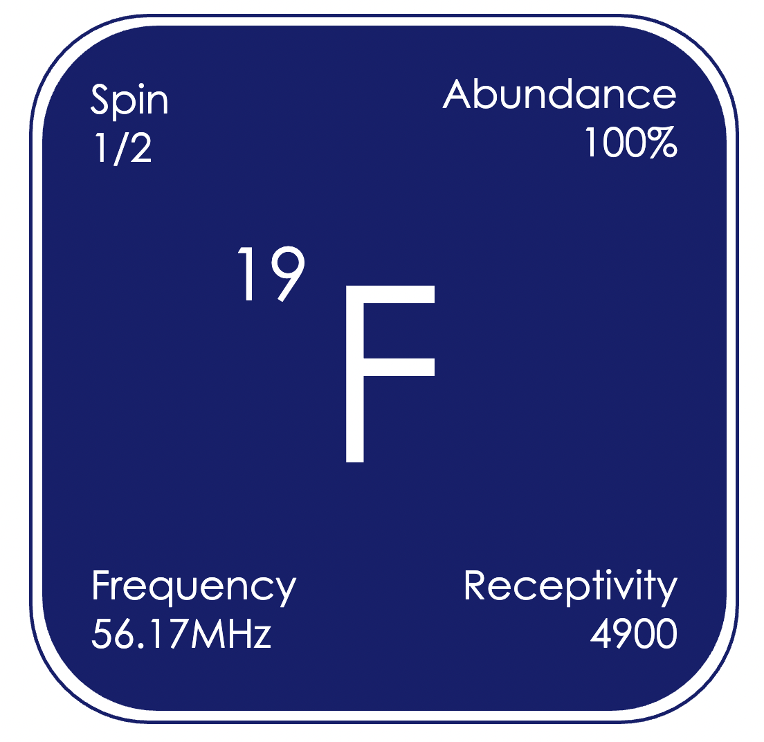 作为第二高接收度的原子核,19F通常被核磁共振谱学广泛研究,它拥有比质子更宽的谱图范围,δF +100~-250 ppm范围内(相对于CCl₃F)。与质子一样, ¹⁹F也是自旋1/2的原子核,通常可观测到F-F和F-H耦合。含氟化合物具有非常广泛的应用范围,包括药品、大宗化学品和电池等电化学设备。