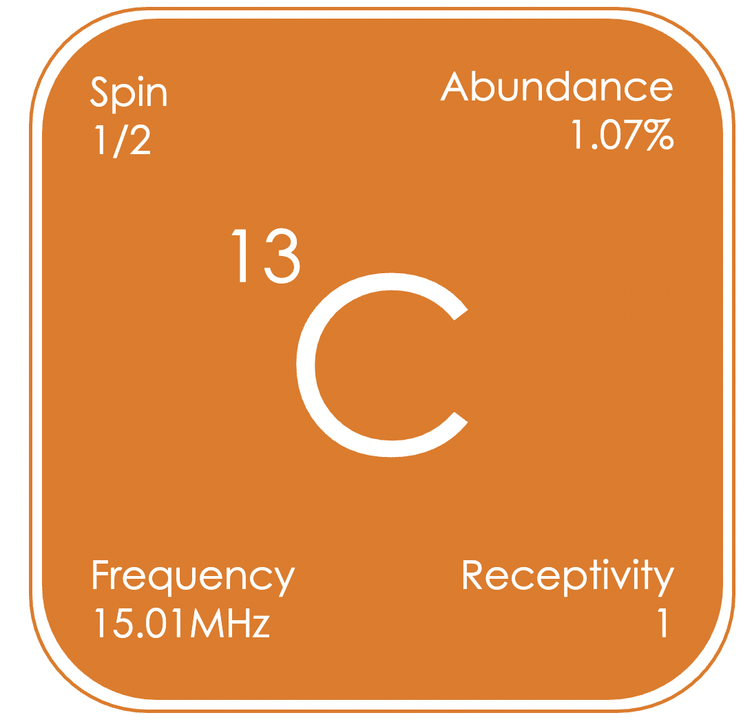 由于碳在有机化学和生命科学中的重要性,碳(13C)可能是核磁共振谱学中除质子以外研究最多的原子核。然而它是所有核磁共振活性原子核中接收度最低的核之一。事实上,如果不是因为它在自然界的普遍存在,13C可能只是核磁共振谱学中不常见的研究核,而不会成为核磁共振发展的驱动力之一。13C NMR谱通常使用去耦技术来获得,以去除氢-碳之间的耦合,这大大简化谱图并且提高了信噪比。大多数小分子有机物产生的质子去耦13C NMR谱(通常表示为:13C{1H}),通常是由化学位移在δC 0~200 ppm范围内的一系列尖锐单峰组成(相对于 CDCl3中的 (CH3)4Si)。