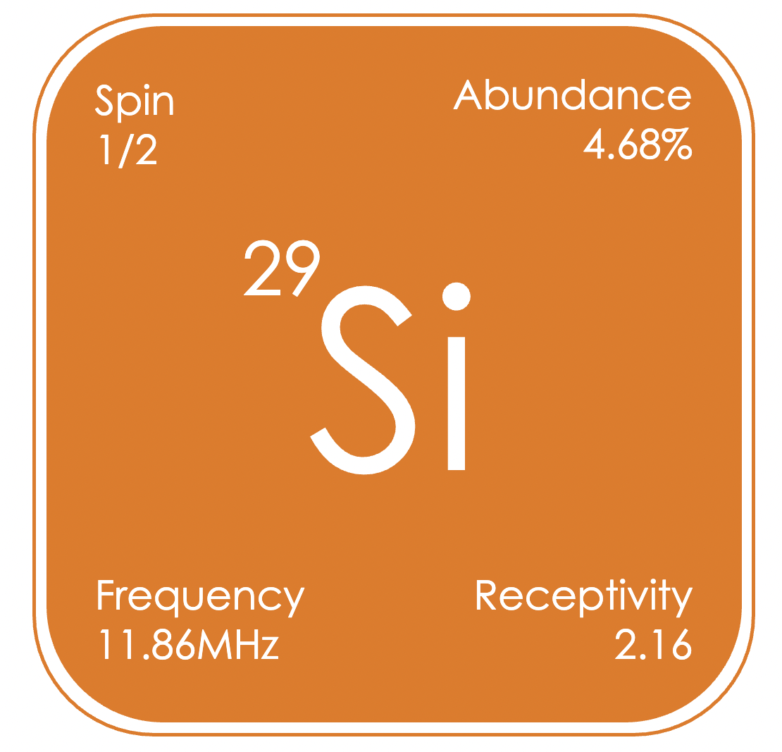 29Si的核磁共振谱具有重要的应用,如分析聚硅氧烷(硅树脂)及其反应单体。聚硅氧烷具有一系列的应用,包括粘合剂、润滑剂和密封剂等,同时在医学和家庭中也广泛使用。29Si具有较低的接收度,信号出现在δSi −350~+175 ppm的宽广范围内(相对于 (CH3)₄Si)。13C核磁共振中使用的一些提高灵敏度的方法也同样适用于29Si核磁共振。例如使用 DEPT(通过极化转移进行无畸变增强)脉冲序列,从而激发更高的接收度的质子,而不是²⁹Si 原子核。