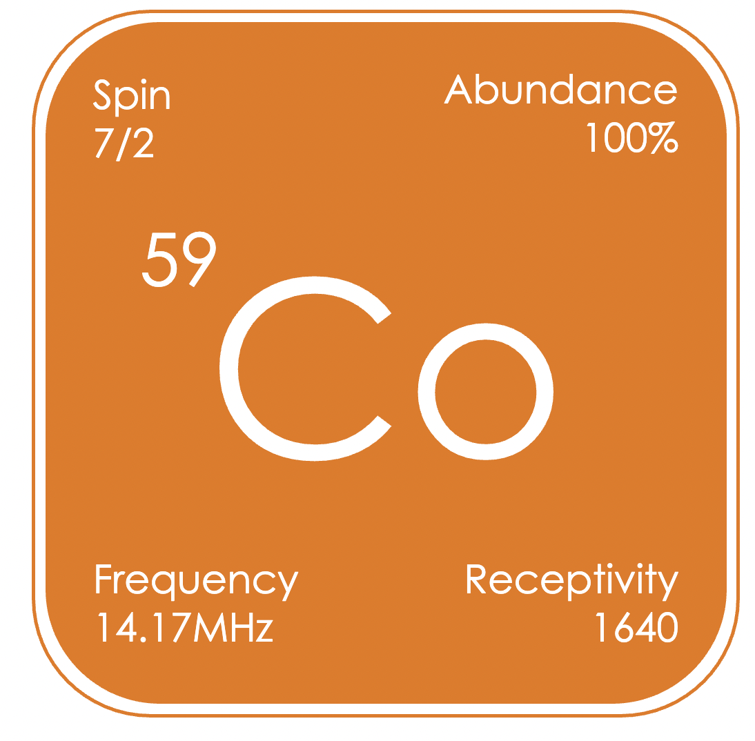 59Co作为第一个观察到不同化合物化学位移变化的原子核,其在核磁共振波谱的发展中发挥了重要作用。由于许多钴化合物是顺磁的,所以59Co NMR谱通常局限于低自旋钴(I)和钴(III)的配合物。钴核的化学位移观察范围是所有核中最大的,达到了δCo −4000~+14000 ppm(相对到 D₂O 中的 K₃[Co(CN)₆]。