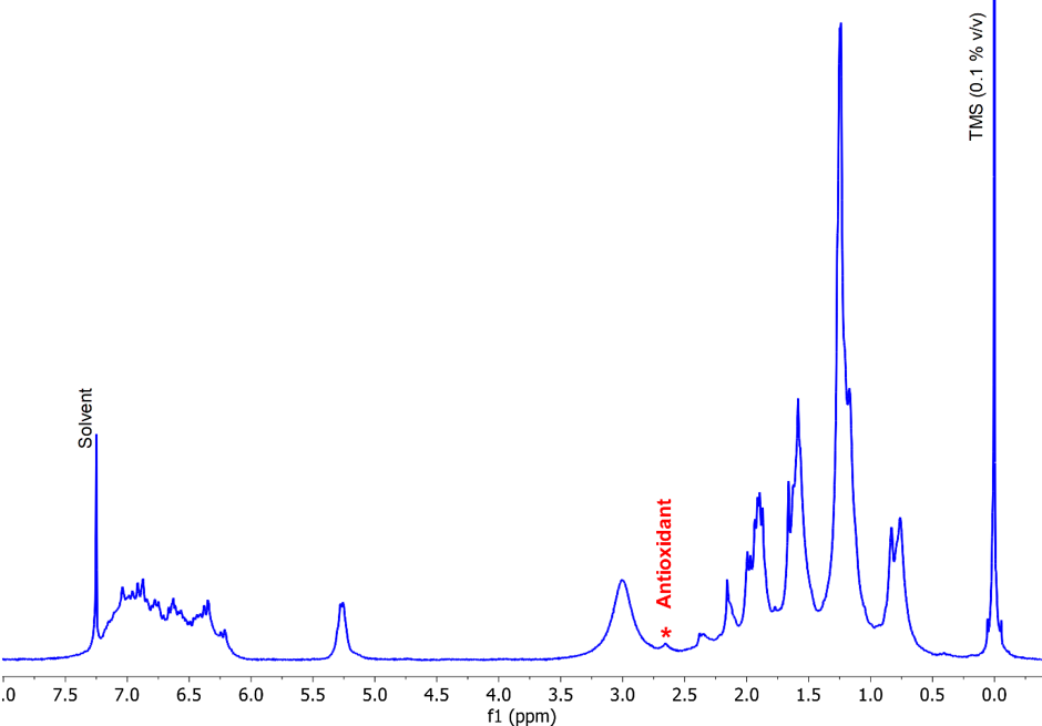 这是一种工业聚合物材料溶液的1H核磁共振谱图。样品取自的产品批次,含有按重量计为0.15%的抗氧化剂(参考值由制造商提供)。溶液中的物料浓度按重量计约为1%。