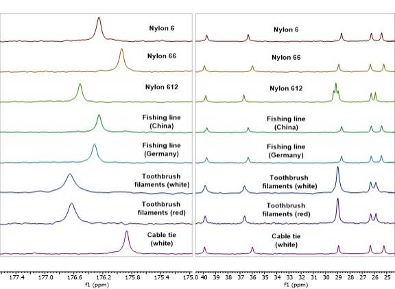 由于谱线分离的固有局限,采用1H核磁共振波谱研究聚合物并不容易。宽而重叠的谱线使谱图分析变得困难。我们研究了13C核磁共振波谱作为识别工业尼龙制品中尼龙类型的替代方法。所有测量都是在37°C的X-Pulse上进行的。聚合物溶液的浓度按重量计约为5%。获得了三种尼龙样品(尼龙6、66和612)的13C核磁共振参考谱图。通过与参考谱图的简单比对,可以确定产品中尼龙的类型。例如,白色的电缆扎带是由尼龙66制成的,而鱼线则是尼龙6制成的。